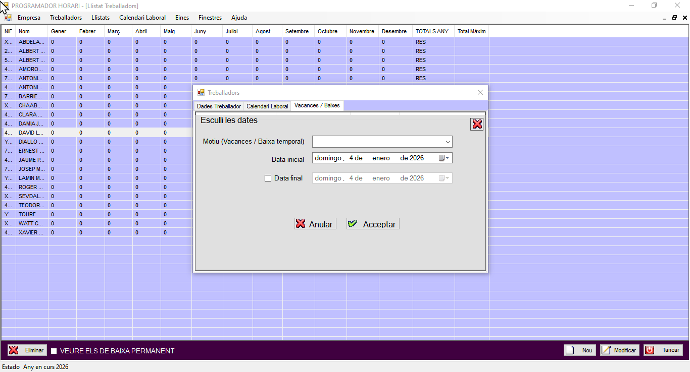 Esta aplicación está diseñada para la gestión integral de fichajes y planificación de horarios laborales, permitiendo administrar de forma centralizada trabajadores, horarios, vaciones, bajas así como generar de forma automatica horarios laborales