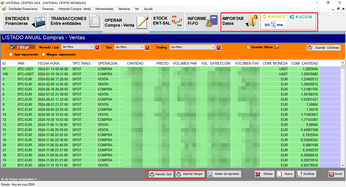 ID,PAR(pares de divisas como BTC-EUR o ETH-USDT),FECHA HORA,TIPO TRADING,OPERACION,CANTIDAD,PRECIO,VOLUMENy las comisiones asociadas a cada intercambio. - Filtros Potentes: Utiliza filtros avanzados por moneda/par, tipo de operación (trading, spot) o rango de fechas para aislar y analizar cualquier subconjunto de datos al instante.