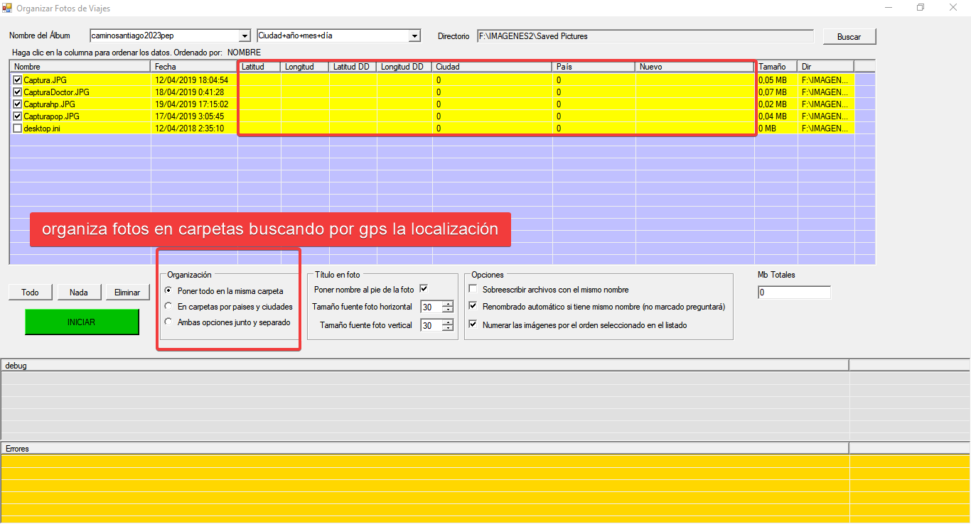 Nombredel archivo,Fecha,Tamaño, y lo más importante:Latitud,Longitud,CiudadyPaisdetectados para cada imagen. - Control Total: Ordena los datos haciendo clic en las columnas para una revisión manual antes de iniciar el proceso.